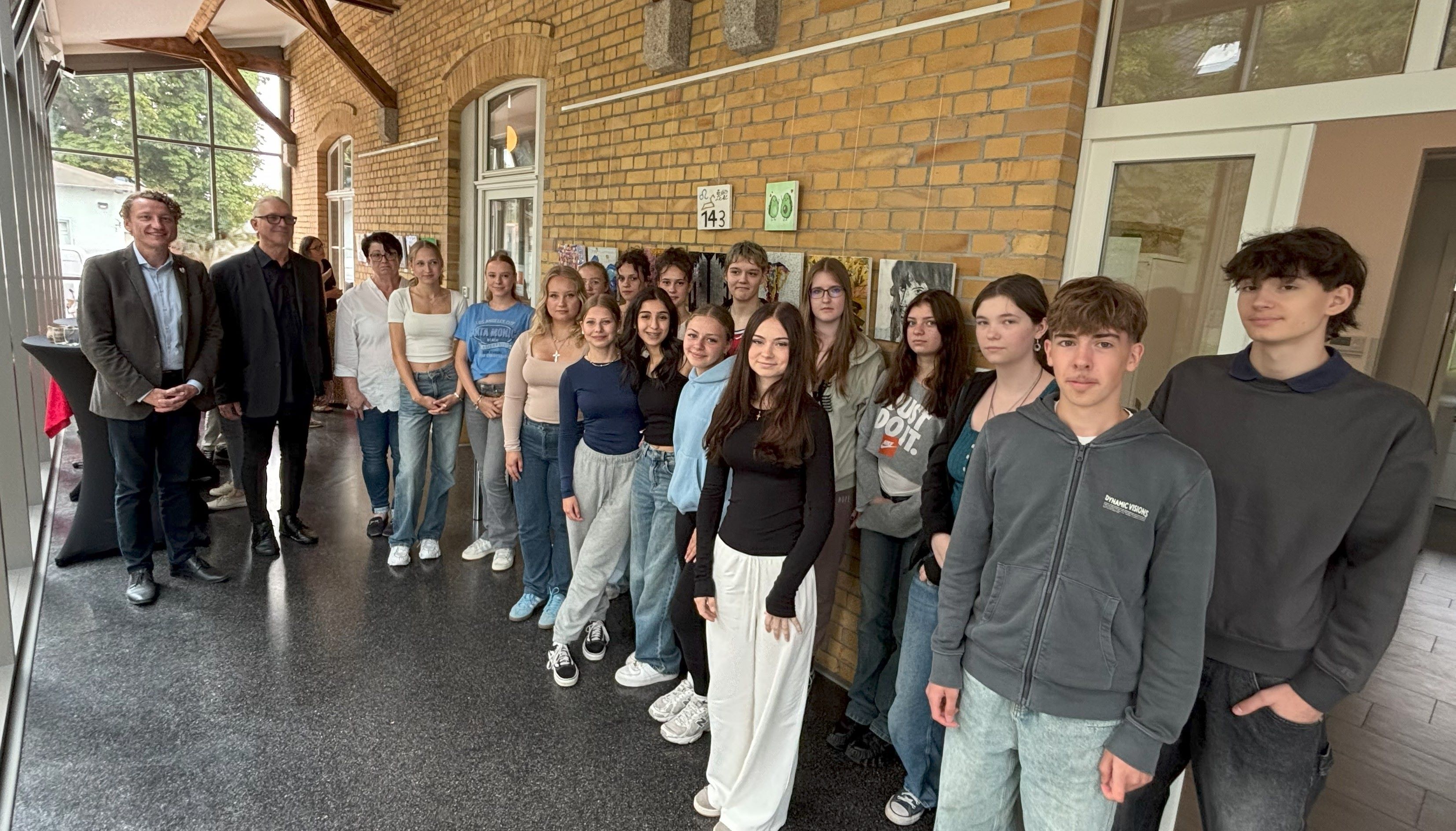 Die Schülerinnen und Schüler des Wahlpflichfaches Kunst mit ihrer Lehrerin Ines Berger, dem Kursleiter Willi Selmer und Bürgermeister Philipp Martens.